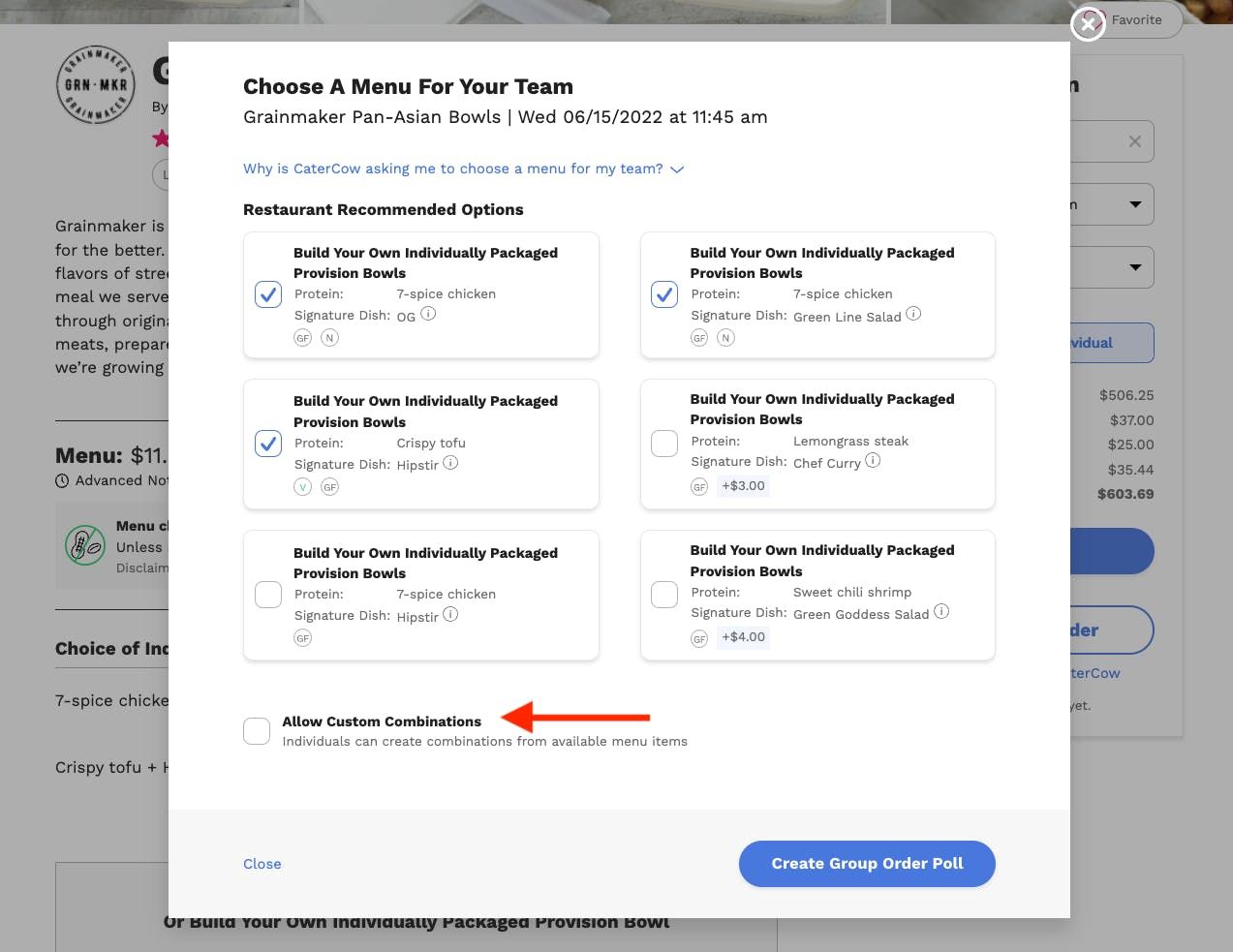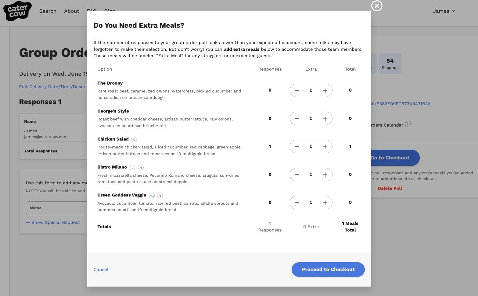 For those ordering for groups who want more control over what they’re eating, we’ve launched a feature called “Polling”, effectively a group order functionality. For select menus, you can send out a link to your team with menu items for them to choose. Once all your employees or guests have chosen what they want, you can make adjustments like adding extra meals for short-notice guests, drinks, desserts, etc. While we've set it up to be relatively self-explanatory, we'll walk you through that process below! If you have any trouble, email us at support@catercow.com and we'll get back to you right away!