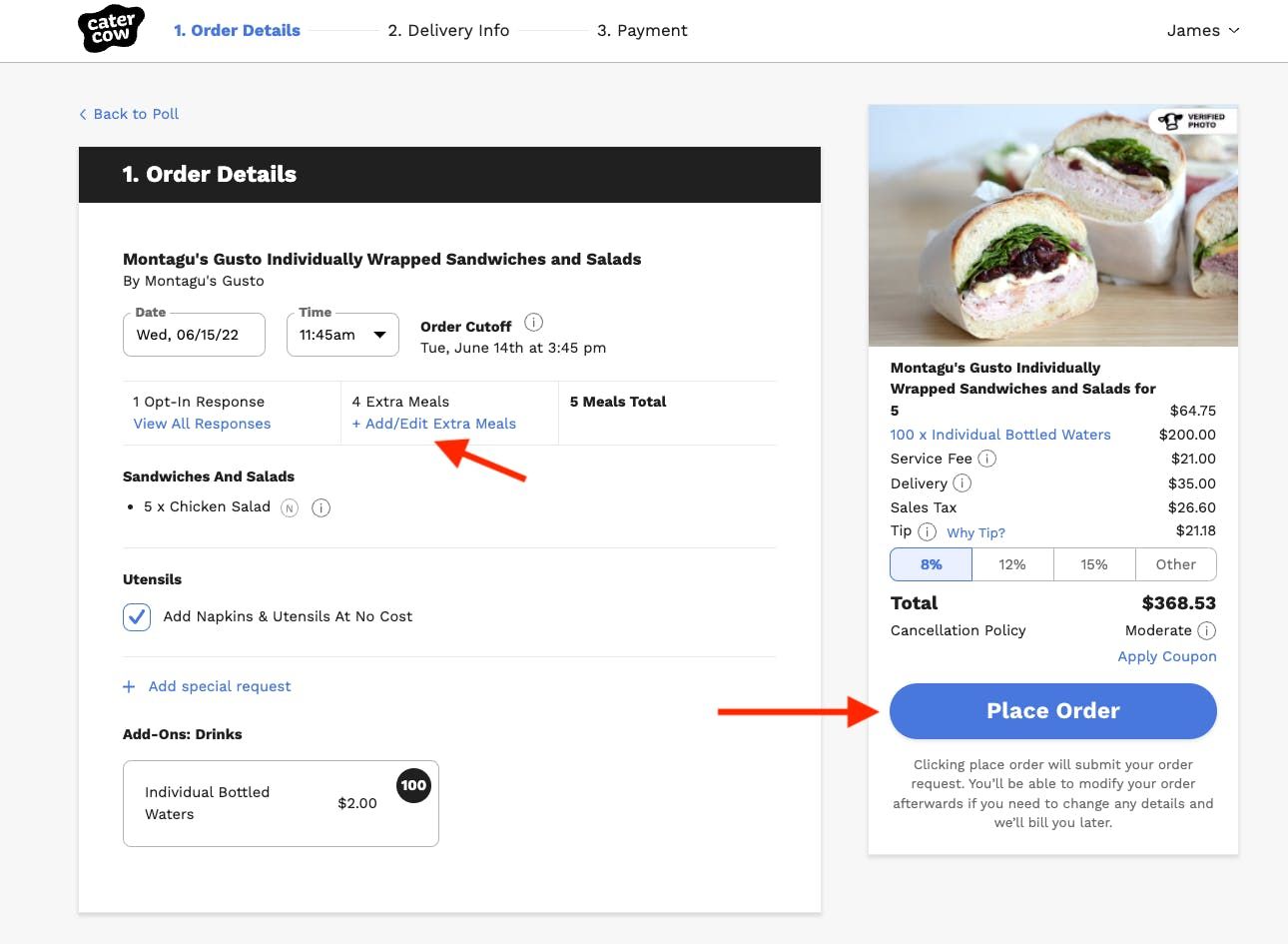10. After clicking the blue "Proceed to Checkout" button, you'll be brought to the official checkout page where you'll be able to review the selections your colleagues made, update your address or delivery details, add on additional items like drinks, desserts etc. (if offered) and we'll give you one more opportunity to add on "extra meals" if you forgot. Once you are ready, you'll click the "Place Order" button!