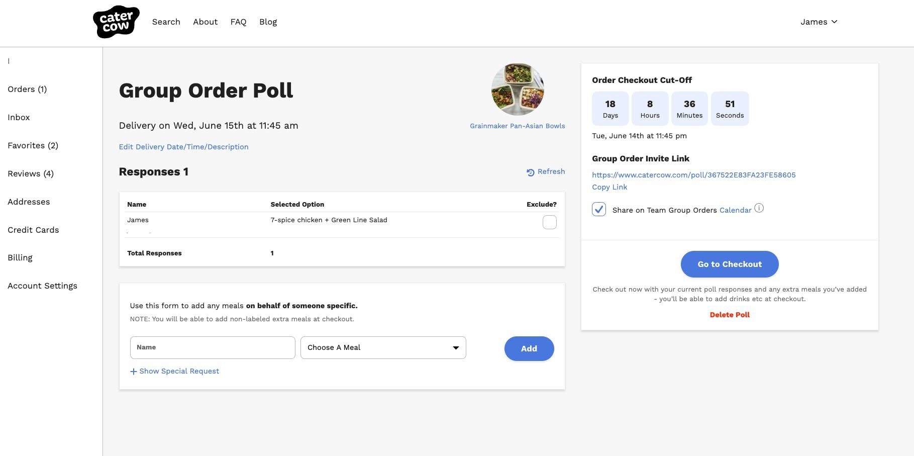 8. Now that you have a poll or two created, you might be wondering where to access them from your CaterCow account? Navigate to your "Orders Page" by hovering over your name in the top right corner of the page and clicking "Orders" from the dropdown. You'll see caterer confirmed orders with solid gray outlines, and prospective group poll orders (waiting to be submitted to the caterer) with a dotted outline. Click the the blue "View Poll" button to get to your specific polls page, where you can track all the responses to your poll, and see and do the items listed in step 7 above