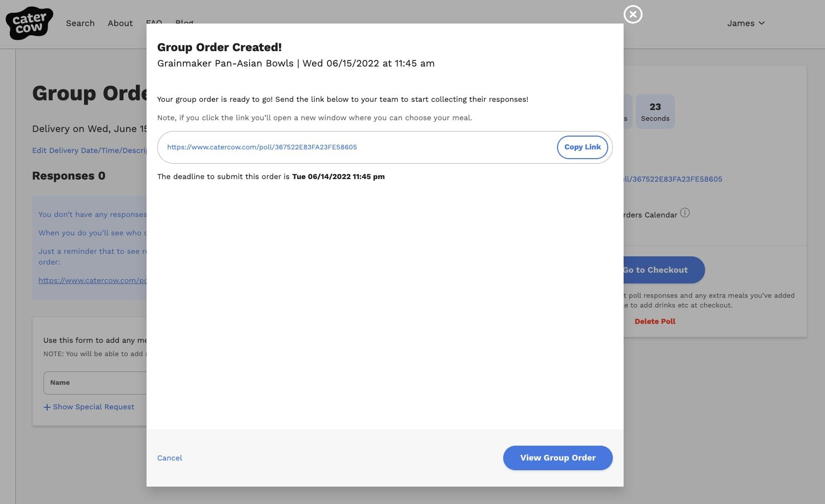 6. You've just created a Group Poll order! Well done. Once you send the link to your team, your teammates will be asked to sign up for an account when they make their first selection so that for further ordering, checking out and choosing options is a breeze.