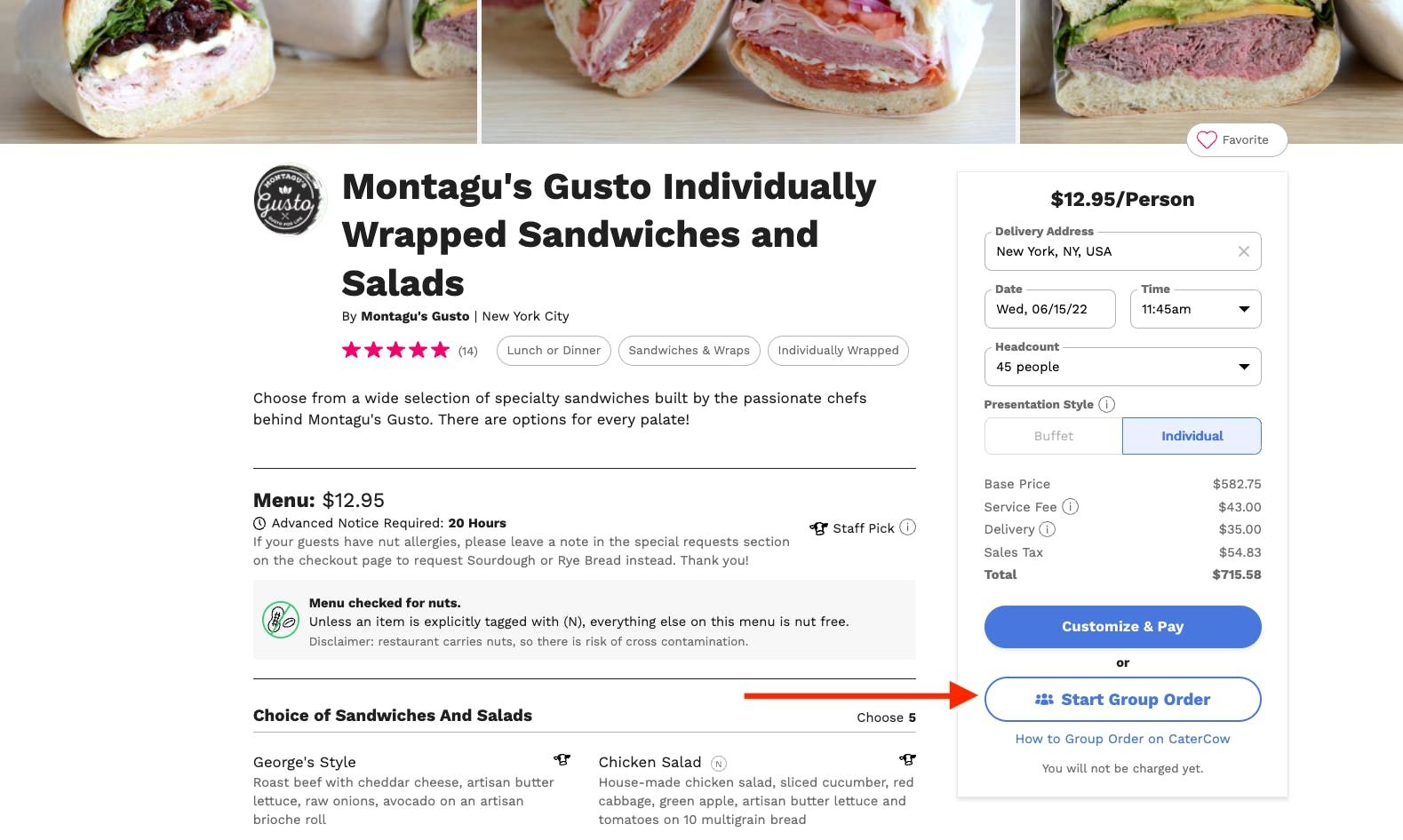 2. When you find the menu you like, click on the menu and it will bring you to the menu details page, which is where you'll find all the details about the specific menu and caterer, as well as where you'll begin the poll process. Click the "Start Group Order" button to start! (clicking the "Customize & Pay" button takes you through a normal orders checkout process)